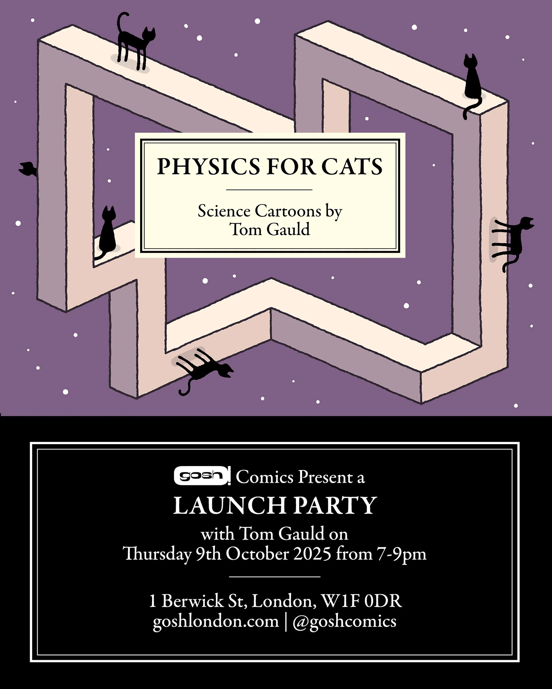 The UK edition of Physics for Cats is being launched with a party at London’s best comic shop Gosh! Come along and get your book signed. Buy a copy from Gosh to get an exclusive free zine.